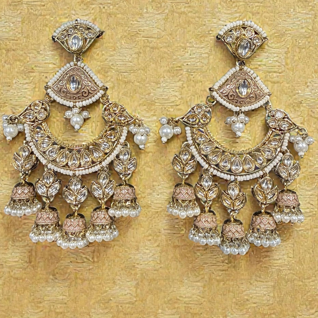 Elevate your look with these statement gold Chandbali earrings, designed with layered kundan-style stones and delicate pearl accents. The structured crescent silhouette is detailed with intricate filigree work, giving the piece a refined and traditional finish.