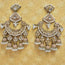 The upper stud features a classic floral motif, flowing into an eye-shaped centerpiece and a grand arched base lined with shimmering stones. Multiple pearl drops and miniature jhumki-style tassels add elegant movement and dimension, creating a rich bridal-inspired look.